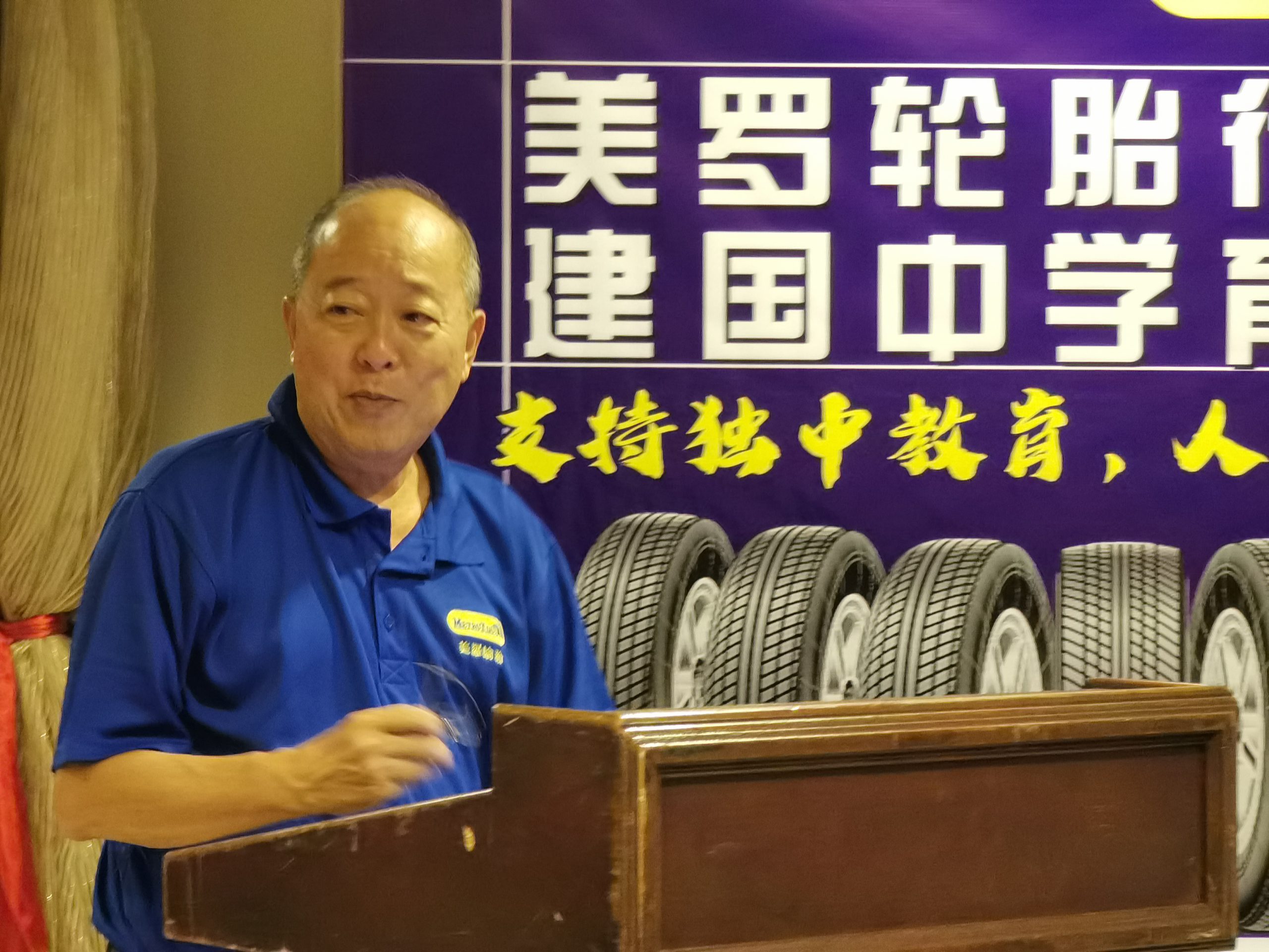 美罗轮胎老板李福炎表示荣幸能够在这里参与亚庇建国中学筹款活动,并为学校的发展贡献一份力量。他希望通过 “美罗轮胎行万里,建国中学育英才”的筹款活动,能够为学校提供一些资金支持,用于粉刷校舍的经费。