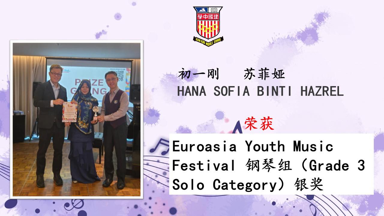 本校初一刚(J1 Gang)学生 苏菲娅(Hana Sofia binti Hazrel) 在 Euroasia Youth Music Festival 钢琴组(Grade 3 Solo Category)荣获银奖!